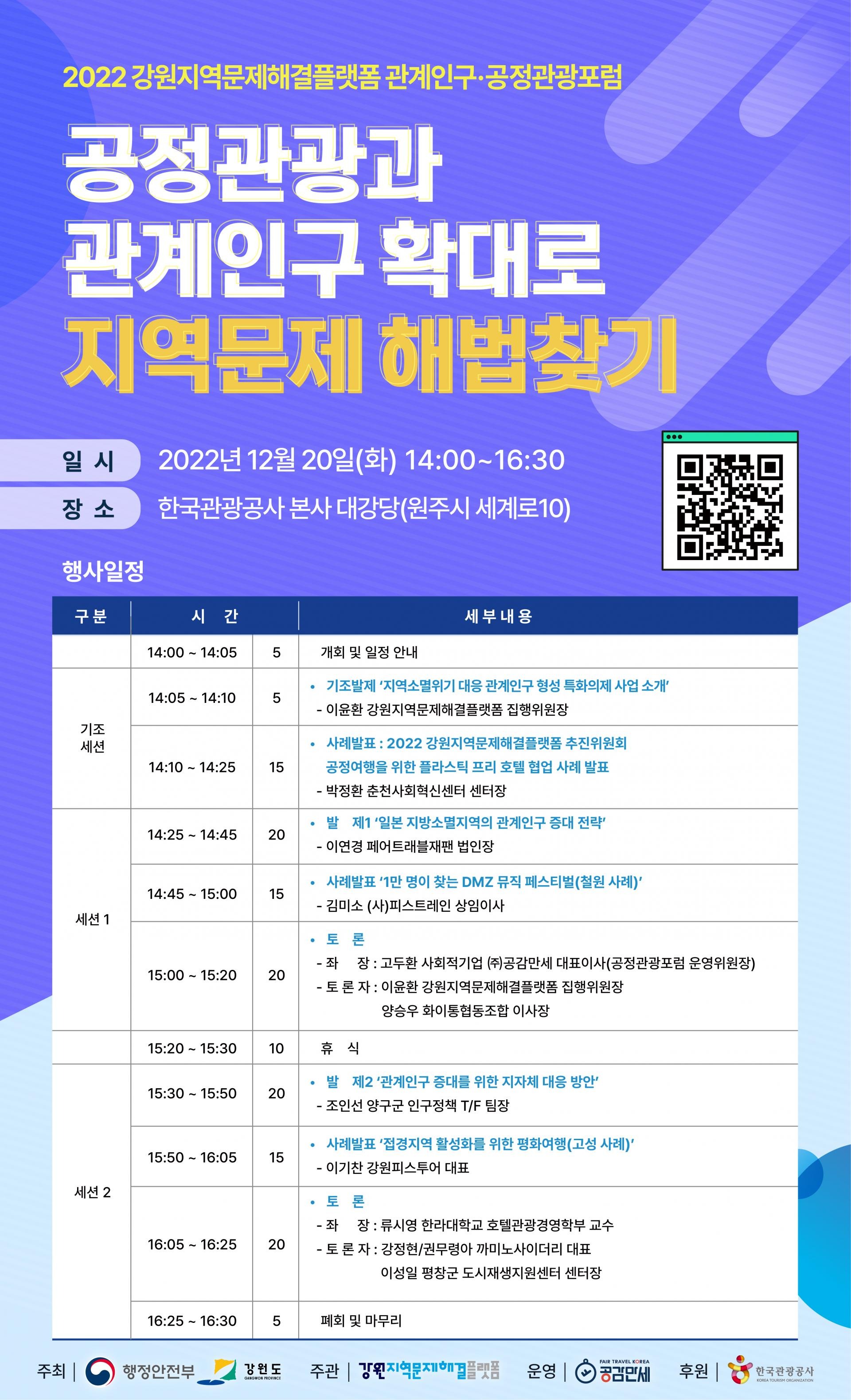 * 공정관광포럼 제12회 월례포럼은 「2022 강원지역문제해결플랫폼 관계인구&공정관광포럼」으로 대체됩니다.
