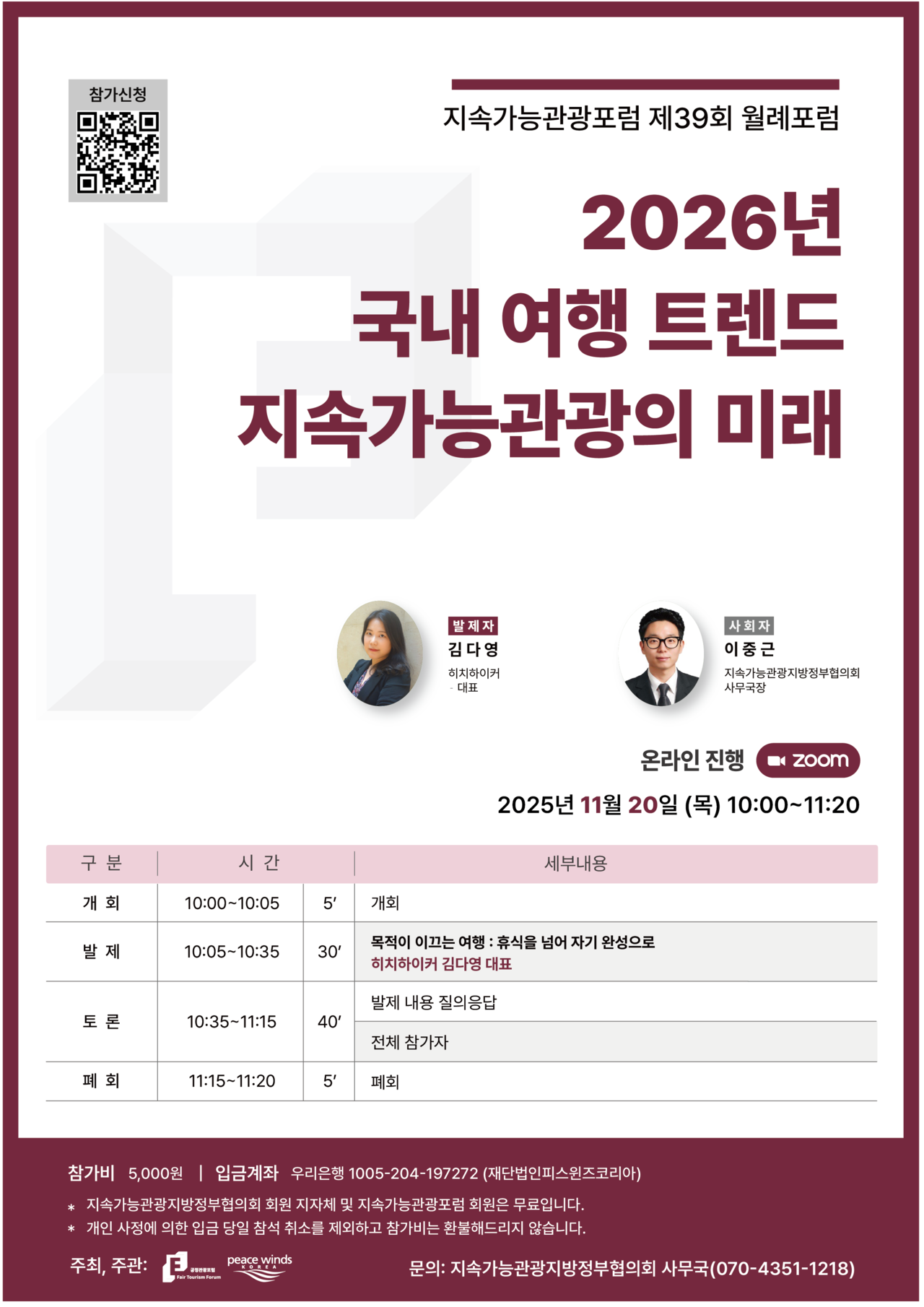 ㅇ(참 가 비) 5,000원 *지속가능관광지방정부협의회 회원 지자체 및 공정관광포럼 회원 무료